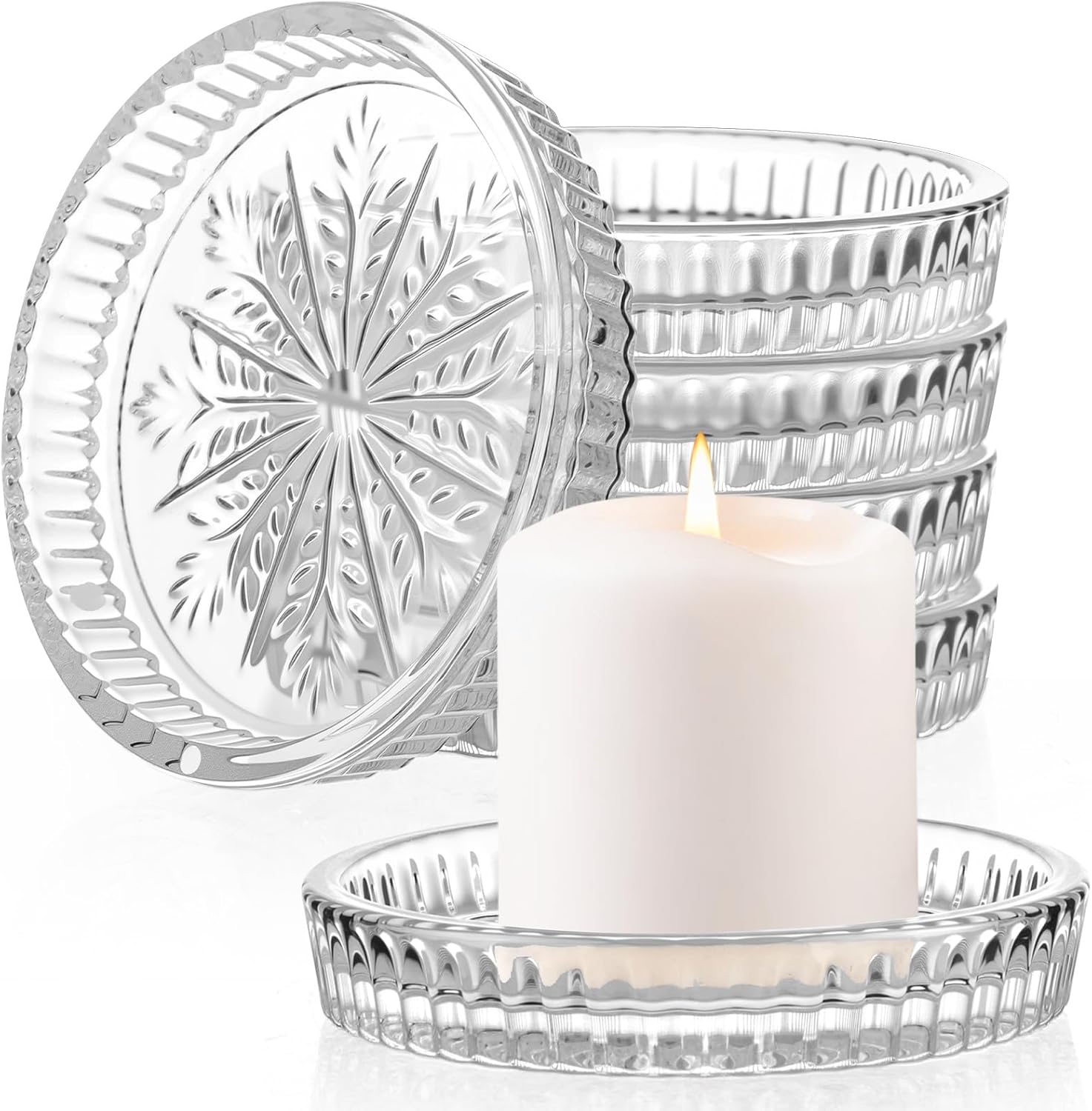 Features: Transparent and bright appearance, distinctive snowflake texture design, clear color, high end and elegant appearance, durable Good material: These glass candle holders are made of thick, durable, heat resistant glass with clear color, reliable quality and long lasting Widely use: This classic clear candlestick features a distinctive snowflake pattern that complements modern, traditional, rustic, and minimalist decor. Suitable for weddings, festive occasions, or everyday tabletop decorations, it easily elevates any space. Specifications: Material: glass Color: clear Size: 3.74 x 3.74 x 0.71 inches/ 9.5 x 9.5 x 1.8 cm Package includes: 12 x Snowflake glass candle holder Notes: Manual measurement, please allow slight errors on size. The color may exist a slight difference due to different screen displays