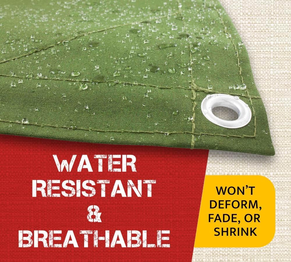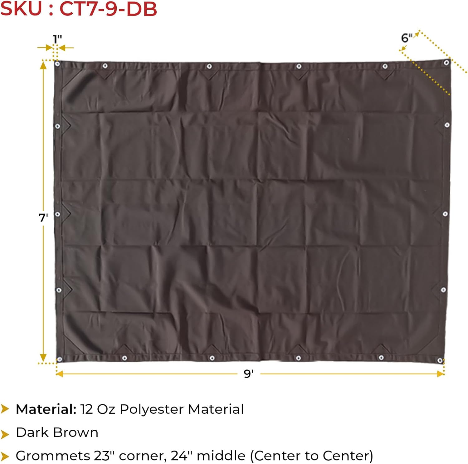 Size: 8' x 10'Weight: 7.05 lbsThickness: 21 milColor: Dark BrownMaterial: 12 Oz PolyesterHeavy Duty water resistant 8' x 10' (finished size) Canvas Tarps from Mytee Products are made with 12 Oz Polyester Material.This Canvas Tarp’s color is Dark Brown and is treated to be water-resistant and breathable.You will find double Stitches on this Canvas TarpGrommets space: 23" in corner and 24" in Middle (Center to Center)Canvas tarps are great for covering stationery items.They reduce condensation as Canvas is a breathable fabric.The thickness of canvas tarps is 21 mil.Canvas Tarps are available in multiple sizes at affordable prices.The weight of the 8' x 10' Canvas Tarp is 7.05 lbs.Water-Resistant Tarp means that it will repel water if water runs off it in a light fashion. In heavier rains or a straight cover, this tarp will eventually have the water soak through.You can water-proof it on your own with a coating of a sealant. Sold separately.Cut Size vs Actual Size for Canvas Tarps:-All our Canvas tarps are hand made and the cut size is going to differ from the listed size by upto 2% or 6".We strive to get as close as possible to the actual size but this is often impossible due to different fabric stretching and machines involved in the manufacturing process.